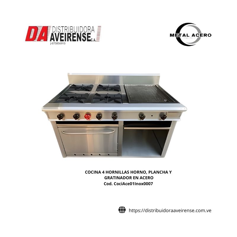 COCINA 4 HORNILLAS HORNO, PLANCHA Y GRATINADOR EN ACERO.